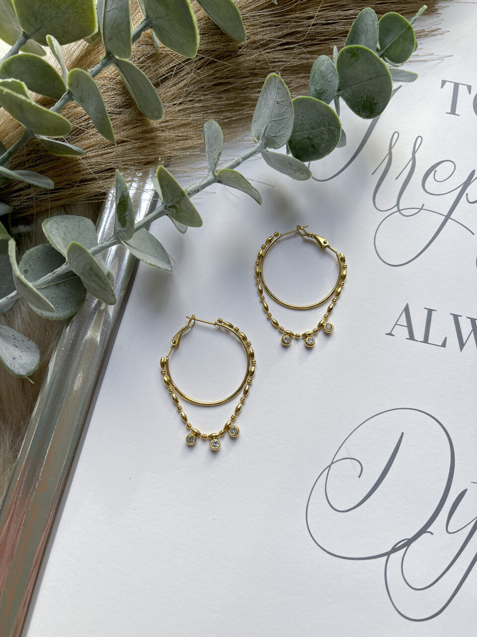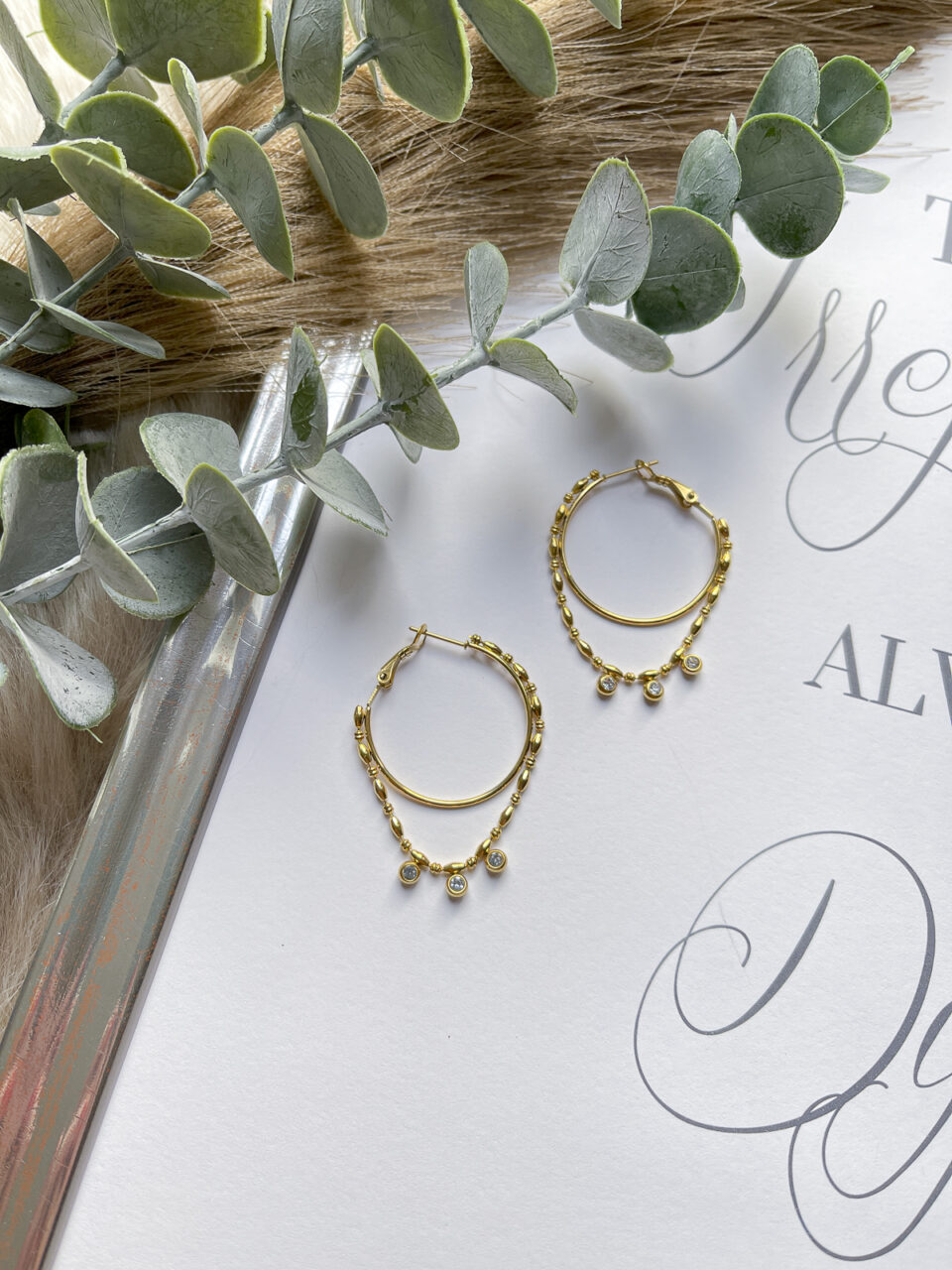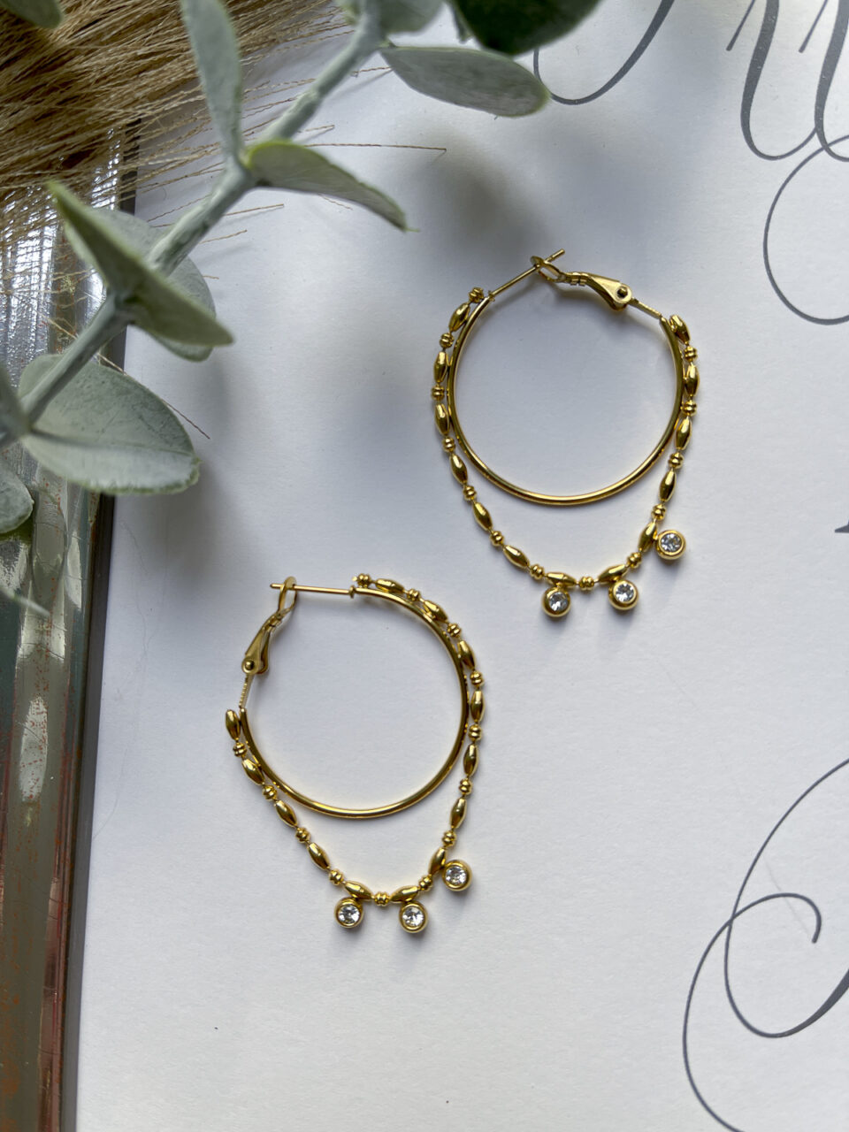 Ausgefallene Creole mit Ketten Appliaktion und kleinen weißen Steinen.